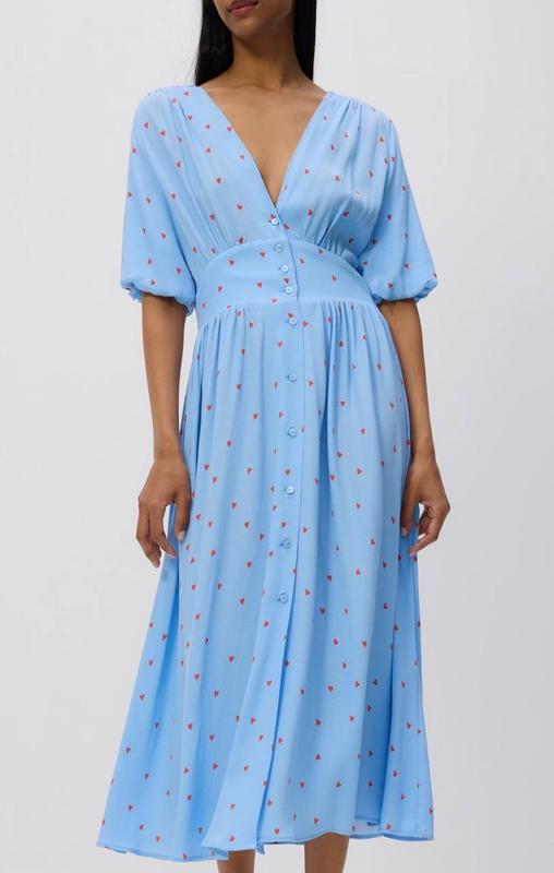 Розкльошена сукня з віскози. V-подібний викот короткі об’ємні рукави відрізна талія застібка на ґудзиках довжина міді суцільний візерунок