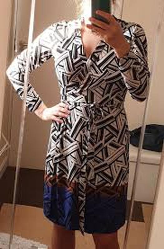 Жіноча сукня на запах, плаття орнамент в одному розмірі, розмір 12 виміри: плечі 39 см, ширина одного плеча 10 см, горловини 20 см ПО грудей 46 см, в поясі 40 см, стегна 50 см, низ 60 см, Довжина 105 см, довжина рукава 60 см, ПО біцепса 17, манжета 9,5 см тягнеться, стан нового.