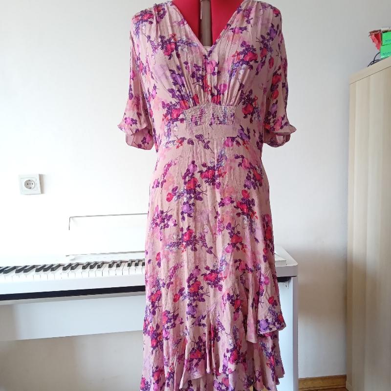 Нова, але має пошкодження внизу. Маленькі затяжки і мікродірочки, та якби киця трохи зачепила) При носці буде не видно, бо вона вся в принт і волани внизу. Або можу вкоротити, щоб прибрати недоліки, за додаткову плату. Ширина в талії 47см, довжина по спинці 110см.