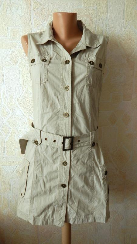 ПОГ 49см, талія 44см, плече 10см, довжина 87см. 4 кармани, металічні пувиці, шліца, пояс.