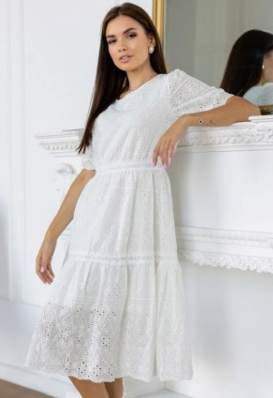 Классное, стильное, качественное, белоснежное платье,крой свободное, ярусами,рукав короткий свободный, вырез под шею, сзади застегивается на пуговицу, ткань качественный хлопок-прошва, имеет тоненькую хлопковую подкладку, состояние идеальный, пог-47, пот-46,поб-59, длина -100, длина рукава -16.