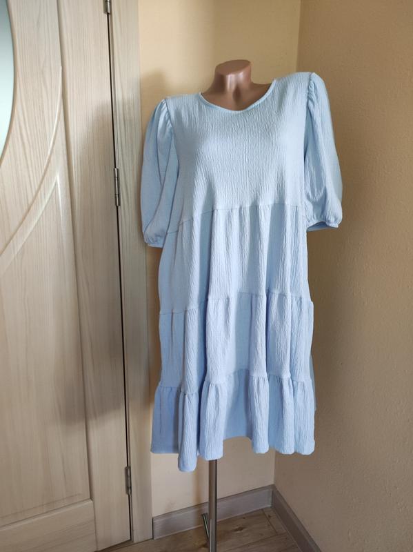 Cукня трапеція. Рукава -ліхтарики. Ніжно блакитний колір Поліестер -99% Еластан-1% Пог-60 Рукав-35 Поб-вільно довжина -90см Розмір вказаний ХЛ,але може бути від 48 до 54 розміру.