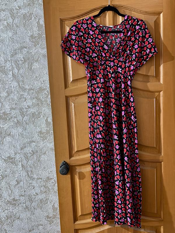 Тканина прикрашена червоними та рожевими бутонами, що створюють романтичний настрій. V-подібний виріз та вільні короткі рукави підкреслюють лінію плечей, а трохи завищена талія візуально подовжує силует. Вільний крій спідниці дарує комфорт і свободу рухів. Ця сукня ідеально підходить як для повсякденного носіння, так і для прогулянок чи літніх зустрічей. Чудово поєднується як із босоніжками, так і з легким спортивним взуттям. 🌺