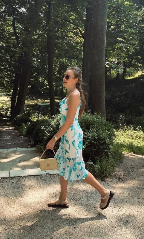Шикарна міді сукня на брительках, має підкладку, не просвічує, на розмір S-M. Легка невагома тканина у квітковий дизайн. Напівобхват грудей 41 см
