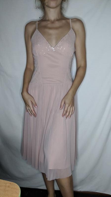 напівобхват грудей 38-48 см напівобхват талії 34-45 см довжина без бретелів 86 см Характерні риси: Сукня має ніжний, легкий вигляд завдяки пастельному кольору (пудровий рожевий), тонким бретелькам, мереживним елементам на ліфі та легкій, спадаючій спідниці, що створює жіночний та витончений образ. Елементи: Колір: Світлий, м'який відтінок рожевого підкреслює ніжність та романтичність. Деталі: Мереживо на ліфі та бантик додають вишуканості та жіночності. Силует: Приталений ліф та вільна спідниця створюють легкий та повітряний силует, характерний для романтичного стилю.