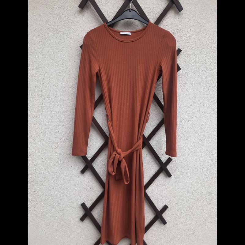 Стильне, коричневе плаття в рубчик, сток -нове, є пояс , міді, куплене закордоном, знижена ціна.Колір тренд осені