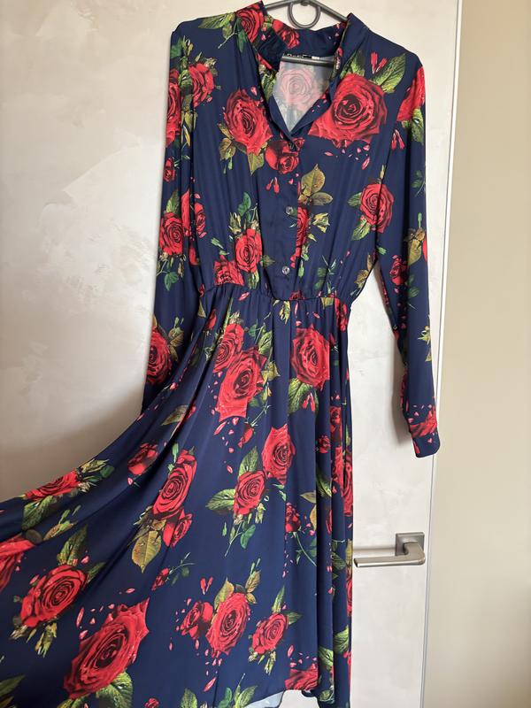 Сукня дуже гарна Колір синій з червоними квітами Талія на резинці є пояс Рукав довгий на манжеті з ґудзиком Довжина з боків довша ніж спереду Є кишені Тканина «прохолодна», трохи тягнеться Заміри надам
