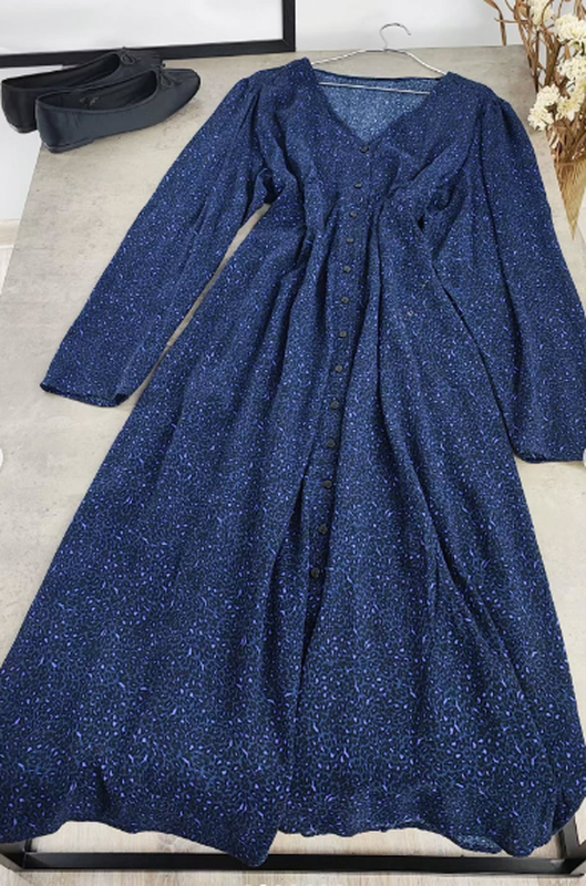 Цупка віскоза, не тягнеться Розмір XL Довжина 123 см Півобхват грудей 68 см Півобхват талії завищений 58 см, регулюється вшитим пояском Півобхват бедер близько 65 см Довжина рукава 64 см Ширина плечей 44 см Є дефект тканини