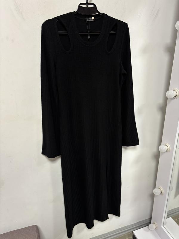 Стильне базове чорне плаття з розрізом Розмір L,склад тканини відсутній, тягнеться дуже добре Довжина 129 Пог 46/63 Пот 42/58 Поб 51/68 Рукав 67, плечі 39