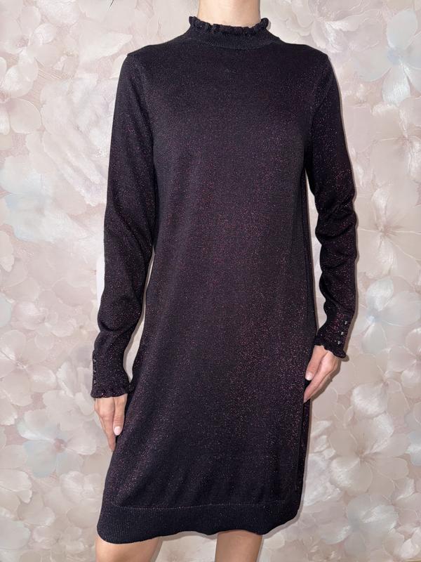 Стан відмінний, без нарікань Колір чорний з мілким люрексом рожевого кольору Розмір 12 Заміри по виробу : Плечі 36 см Рукав від плеча 64 см Ширина під пахвами 47-48 см В стегнах 51 см Довжина по спинці від комірця 91 см Тканина - вʼязаний трикотаж, дуже добре тягнеться