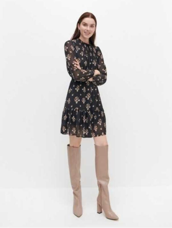 Гарна жіноча сукня Reserved чорного кольору з ніжним квітковим візерунком. Легка, повітряна та дуже зручна — ідеальний варіант для осені, весни або вечірніх виходів. Сукня має вільний крій, довгі рукави та приємну підкладку. Підкреслює фігуру і додає жіночності 🌸 Колір: чорний з бежевими квітами Розмір: XS Стан: нова Висота моделі: 180 см Гарно поєднується з черевиками, кросівками або підборами