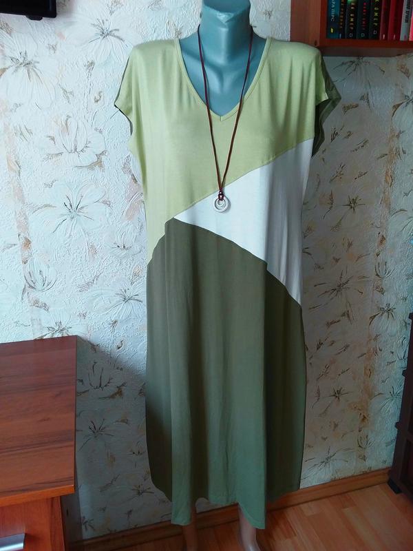 Розмір на фото 2, краще орієнтуватись на заміри. Стан ідеальний, без дефектів. Тканина як футболка, середньої щільності, добре тягнеться, 95% віскоза, 5% еластан. Кольори краще передані на першому фото. Заміри: - довжина від верхньої точки плеча до низу: 109. - довжина рукава від горловини: 20. - напівобхват вирізу для руки: 23 тягнеться до 30. - напівобхват грудей: 53 тягнеться до 63. - напівобхват талії: 54 тягнеться до 64. - напівобхват стегон: 69 тягнеться до 79. 10