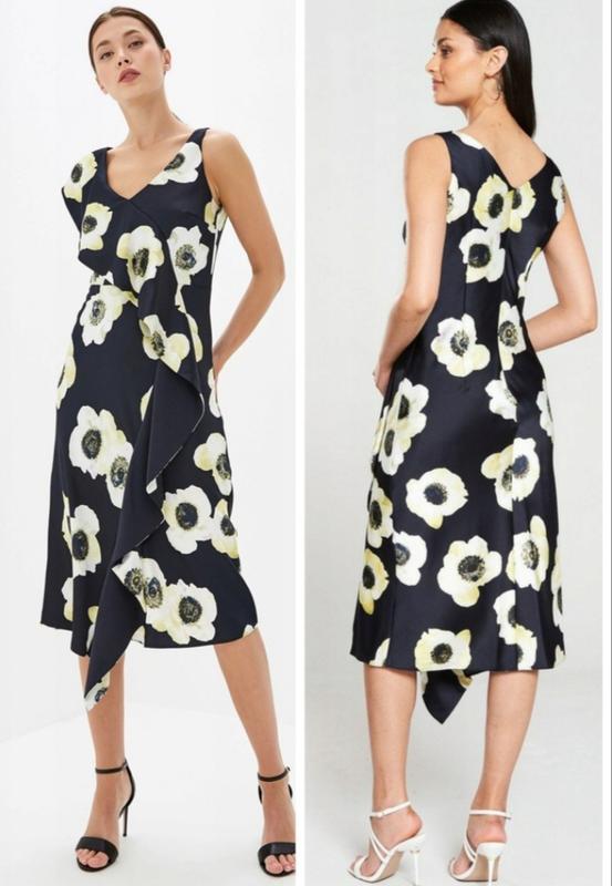 Платье женское в цветочный принт, перед с оборкой, застежка на молнию сзади, ткань атласная на подкладке, размер указан 36, замеры на фото, новое без буйной бирки, безposансов