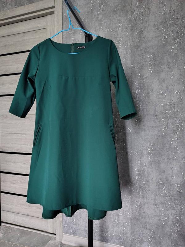 Красива сукня, позаду трохи довше, фасон трапецією, є кишені. Розмір вказано 38. Пог- 45, пот – 45, пос – вільно. Довжина попереду – 80, позаду - 86