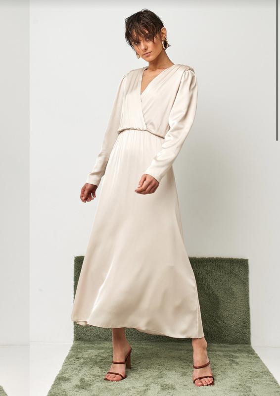 Елегантна сатинова сукня у ніжному бежевому відтінку. Модель із запахом, довгими рукавами та акцентом на талії створює жіночний силует. Ідеальний варіант для вечора, свят чи стильних буднів. ✨ Розмір: с-м Стан: нова / відмінни