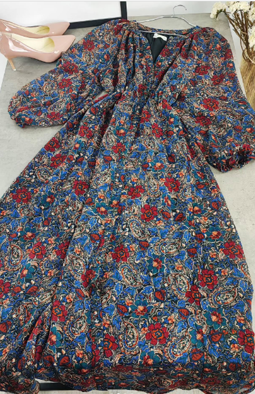 Шифон з підкладкою Розмір L, можна на М Довжина 129 см Півобхват грудей 55 см Півобхват талії 45 см, незначно тягнеться Півобхват бедер 63 см Довжина рукава від горловини 64 см Стан нової речі