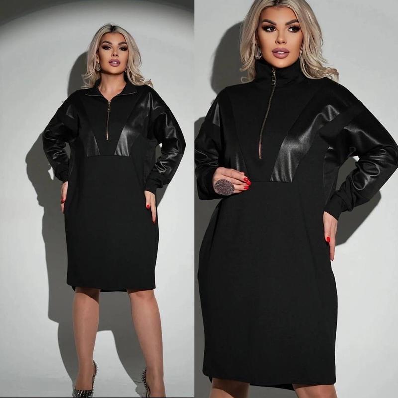 Плаття Модель 1012VL Ціна: 880 грн Розміри : 46-48,50-52,54-56,58-60 Тканина : екошкіра, двонитка ( гарної якості) Колір : чорний Плаття трішки вільного та цікавого крою : вертикальні вставки зі шкіри витягують силует , роблять фігуру більш витонченою, а вертикальна молнія прикрашає та подовжує фігуру. Горловина-стійка , довжина виробу нижче колін. Заміри виробу : Розмір 46-48: Обʼєм грудей 112 Обʼєм талії 102 Обʼєм стегон 112 Довжина рукава від горловини 68 Довжина по спинці 104 Розмір 50-52: Обʼєм грудей 118 Обʼєм талії 108 Обʼєм стегон 118 Довжина рукава від горловини 69 Довжина по спинці 105 Розмір 54-56 Обʼєм грудей 124 Обʼєм талії 116 Обʼєм стегон 126 Довжина рукава від горловини 71 Довжина по спинці 106 Розмір 58-60: Обʼєм грудей 138 Обʼєм талії 126 Обʼєм стегон 138 Довжина рукава від горловини 72 Довжина по спинці 108