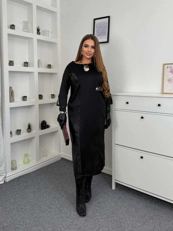 Плаття Модель 1128vl Ціна : 1000 грн Розміри : 46-48,50-52,54-56,58-60 Тканина : дайвінг , шкіра Плаття приталеного силуету , з боку вставка з екошкіри, яка подовжує та витягує візуально фігуру . По низу розріз , з боку на талії «хлястік» з ґудзиками , рукава нижче ліктя прикрашені ґудзиками та шкіряним патиком . Заміри виробу по зовнішньому шву: Розмір 46-48: Обʼєм грудей 100 Обʼєм талії 94 Обʼєм стегон 100 Довжина рукава 41 Довжина 120 Розмір 50-52: Обʼєм грудей 108 Обʼєм талії 102 Обʼєм стегон 106 Довжина рукава 42 Довжина 120 Розмір 54-56: Обʼєм грудей 122 Обʼєм талії 116 Обʼєм стегон 124 Довжина рукава 43 Довжина 120 Розмір 58-60: Обʼєм грудей 134 Обʼєм талії 128 Обʼєм стегон 136 Довжина рукава 44 Довжина 121