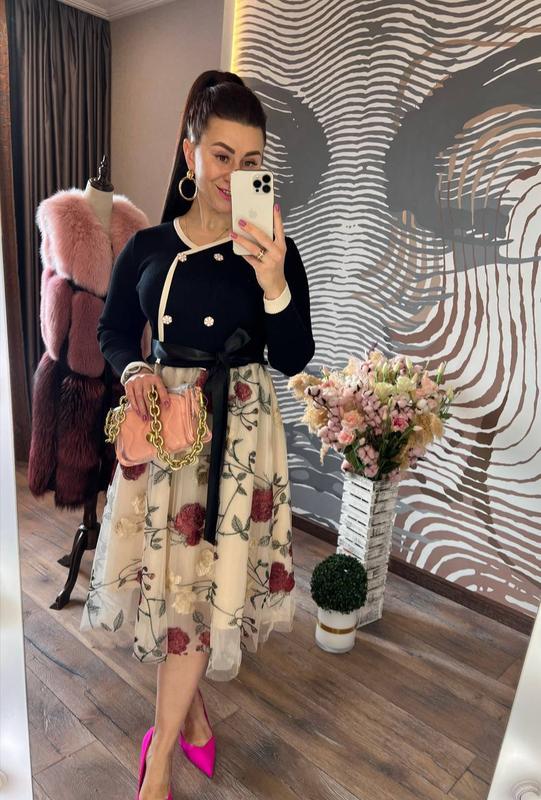 шикарна сукня приталеного силуету вигідно підкреслить красу вашої фігури і гарний смак, вона виготовлена з якісного трикотажу машинного в'язання, декорованого витонченими ґудзиками у верхній частині та розкішною спідницею з сітки, прикрашеної квітковою вишивкою у нижній частині з під'юбником із креп атласу, тонкий атласний пояс доповнить прекрасний образ розмір єдиний 42-44 довжина 112-114 см, пг 42-44 см добре тягнеться, довжина рукава від шиї 66-68 см код 0471