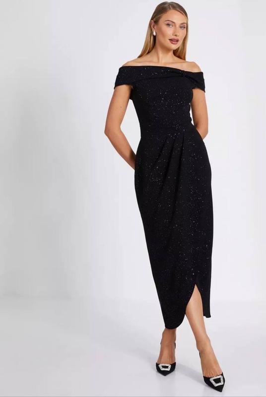 Чорна блискуча міді-сукня Quiz з відкритими плечима у фасоні «Бардо». Облягаючий ліф із ефектом запаху та драпіруванням спереду підкреслює силует. Асиметричний поділ із невеликим розрізом додає жіночності, а тканина з блискітками робить образ святковим та елегантним✨🖤 Розмір: 40(L)