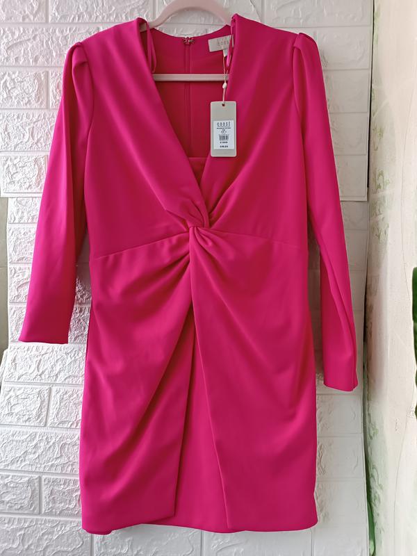 очень красивое женское платье ярко-розового цвета, имеет две затяжки на нижней части юбки- сверху не видно, длина 87, полуобхват груди 49+, плечи 39, длина рукава 54.