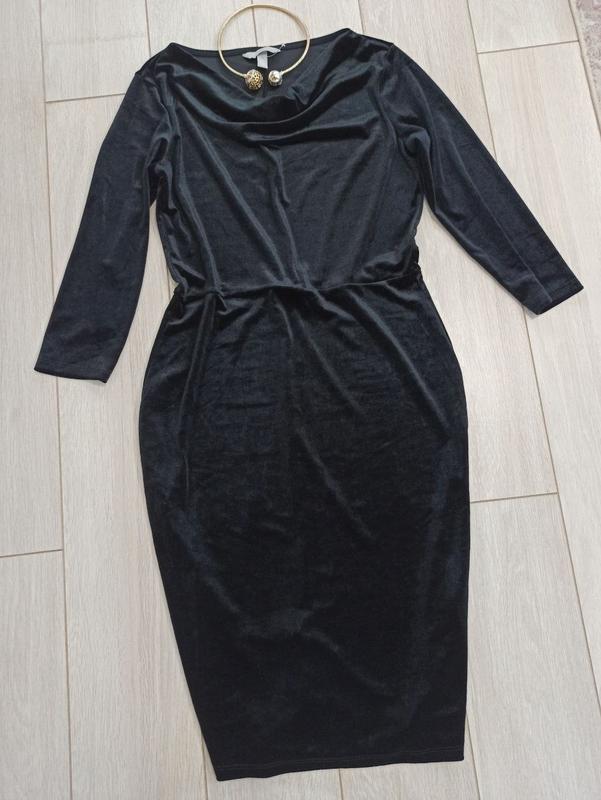 Вишукана оксамитова сукня плаття міді чорний колір, з гарним оформленням горловини, прилягаючі рукави, тягнеться, H&M. Розмір С-М. Заміри: ОГ 92-96, ОТ 78-82, ОБ 104-108, довжина рукава 45, довжина 102.