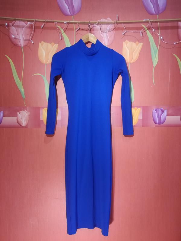 Сукня міді синя з ворогом стійкою, матеріал тягнеться, довгий рукав. Матеріал щільний, не світиться. Заміри в спокої: під пахвами 86см ОТ 70см ОС 88см Довжина від плеча 118см