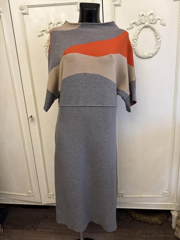 Трикотажна сукня міді. Трикотажне полотно щільне, добре тримає форму. Без підкладки. Колір сірий/помаранчевий/ бежевий. Розмір по бірці-2. Заміри: довжина-113 см, ПОГ-45 см, ПОБ-46 см. Стан ідеальний.
