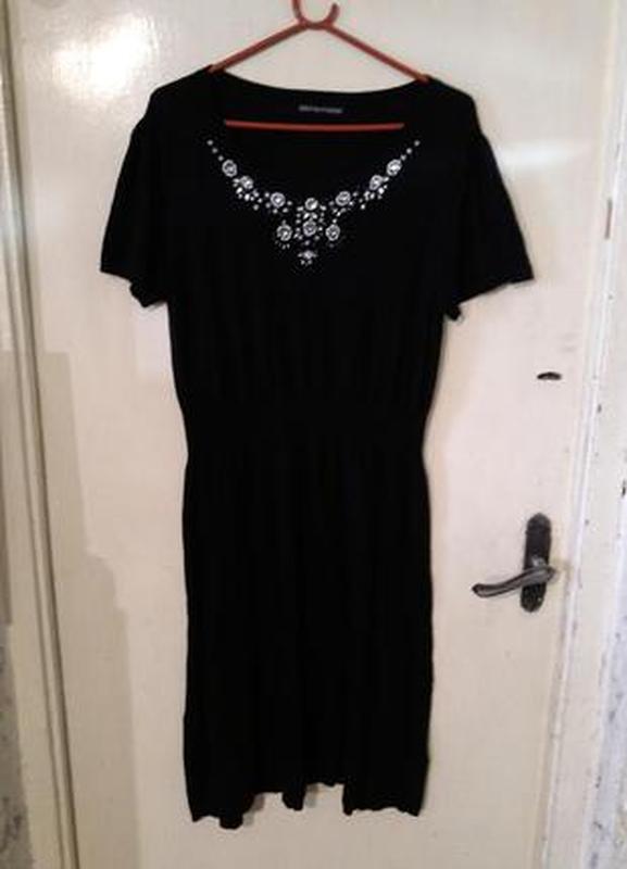Елегантне,трикотажне, плаття,18-го розміру,Definitions.Чорне з красиво розшитий декольте.Дуже тягнеться.Якісний пошиття.ПОГ -50см тягнеться до 90см,ПІТ 44см тягнеться до 74см,ПОБІДИ 58 тягнеться до 88см, довжина по спинці -110см.Актуально до кінця липня.