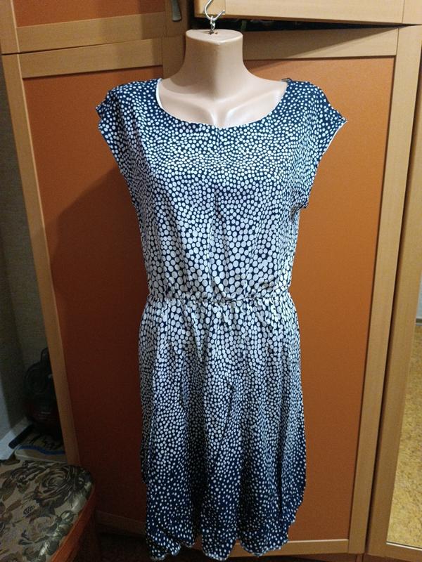 сукня у горох, розмiр М, талiя на гумцi, бiрка зi cкладом зрiза6а, якiсть класна, колiр синiй, замiри: плечи 50 (приспушенi), груди 47, талiя39-50, довжина 94