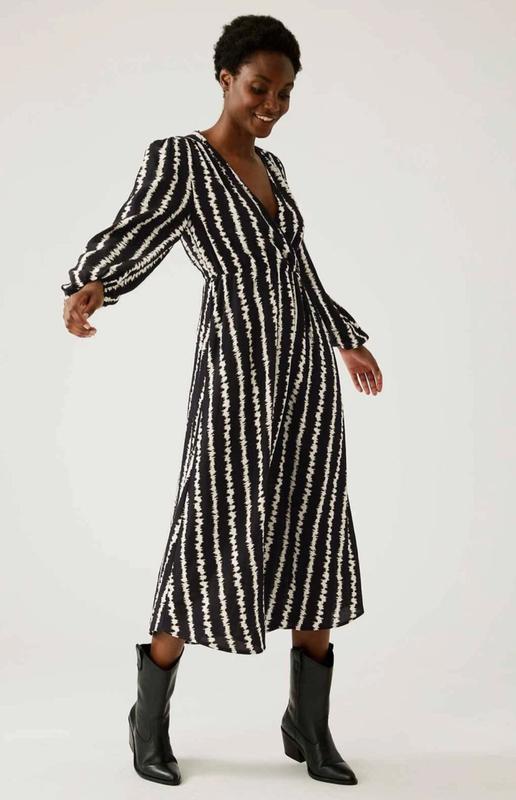 Красивое платье миди с длинным рукавом Marks & Spencer, p. 16, 44 европ. Состояние новой вещи. 100% вискоза. По грудях на запАх, в поясі вшита резинка. По краю рукава резинка, рукав объемный. Вертикальные полоски будут вытаскивать силуэт, визуально стряхнуть. 100% вискоза. Вещь без постороннего запаха. Элегантное красивое платье от качественного бренда. длина 130, юбка от талии 89 плечи 41 ПО груди замер по спинке 58, + спереди запАх ПО талии 40-56, резинка ПО стегон 71 рукав 67 Отпрашиваю УП, Мост, Розетка безопасной оплатой или по оплате на карту - на Ваш выбор. Новой почтой - по оплате на карту. Есть много красивых вещей этого размера – смотрите мое объявления. Приглашаю подписаться на мою страницу - красивые вещи по приятным ценам, постоянное обновление и скидки.