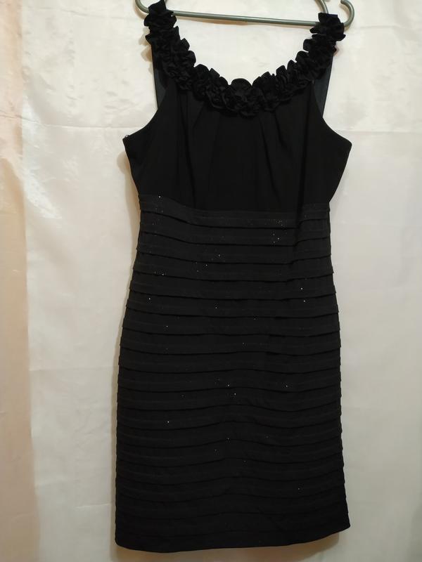 Нарядное, красивое и интересное платье, которое садится по фигуре. Юбка слегка блестит. Вырез горловины, украшен рюшей в виде цветов розы. Размер 50/52. Замеры: Полуобхват груди - 50 см Полуобхват талии - 44 см Полуобхват бедер - 54 см Длина изделия (от верхней точки лямки до низа) - 96 см
