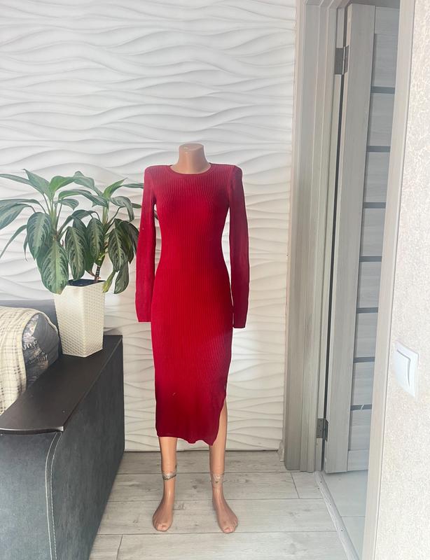 Червона в’язана сукня облягаючого силуету. Має довгі рукави, круглий виріз та довжину міді. Тканина рубчик, що підкреслює форму, а збоку внизу є невеликий розріз для зручності руху. Стильна, елегантна й жіночна модель.
