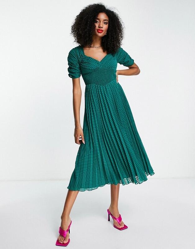 Стильна смарагдова сукня міді ASOS DESIGN. Модель з красивим серцеподібним вирізом, об’ємними рукавами та плісованою спідницею. Дуже гарно сідає по фігурі, підкреслює талію, виглядає дорого та святково. • Uk 10 • Довжина міді • Плісирована спідниця, еластичний верх • Якісна тканина, при русі створює легкий хвильовий ефект 📌 Усі речі нові. Бірки зрізані сайтом — це оригінальний outlet ASOS. ASOS зрізає бірки на стокових речах, щоб їх не повертали за повною ціною — це офіційна політика бренду.