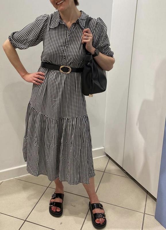 Сукня вільного крою, виготовлена з бавовняної суміші. Пишні рукава відрізна талія оборка по низу дрібний візерунок квадратів мереживом,розмір вказаний uk 20-22,eur 50/52,підійде на 56-60р,орієнтуйтесь на виміри 👇👇 👇👇 Плечі 38 см Пог-52-54 см Пот 49-50 см Пос 63-65 см Рукав- 38 см,ширина 25 см Довжина 123 см,до шва 38 см Art 4538.37