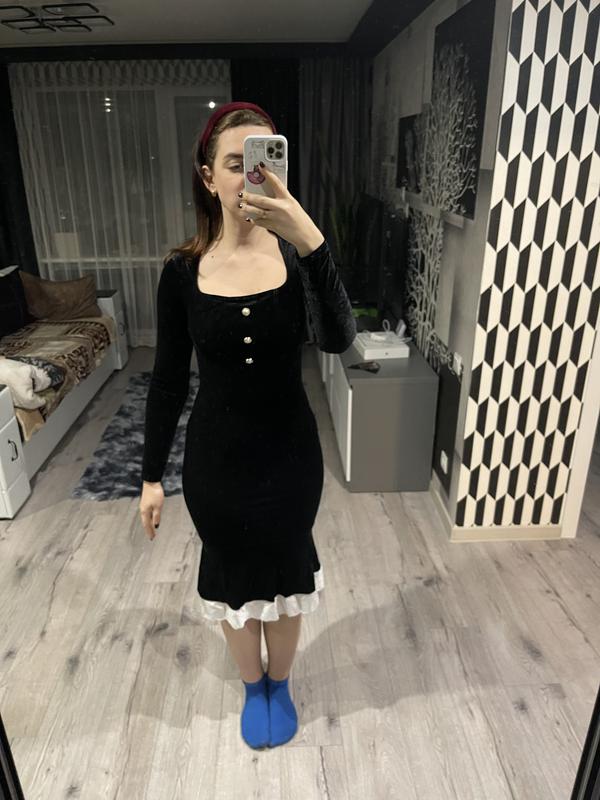 Нова Вечірня чорна оксамитова сукня зі змішаним віскозним додаванням. Елегантний та стильний вибір для особливого випадку. Новорічна велюрова вечірня сукня чорного кольору. На параметри одягнена Зріст: 177 Ог 88 От 73 Об 102 Рукав 60 від плеча