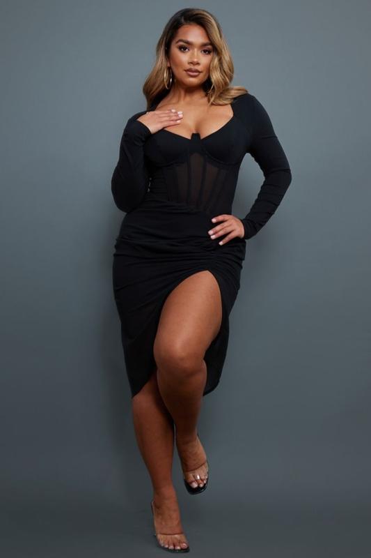Корсетна сукня міді чорного кольору з драпіруванням на спідниці. Застібається на прихований замочок ззаду. Бренд Prettylittlething Розмір UK 14 L