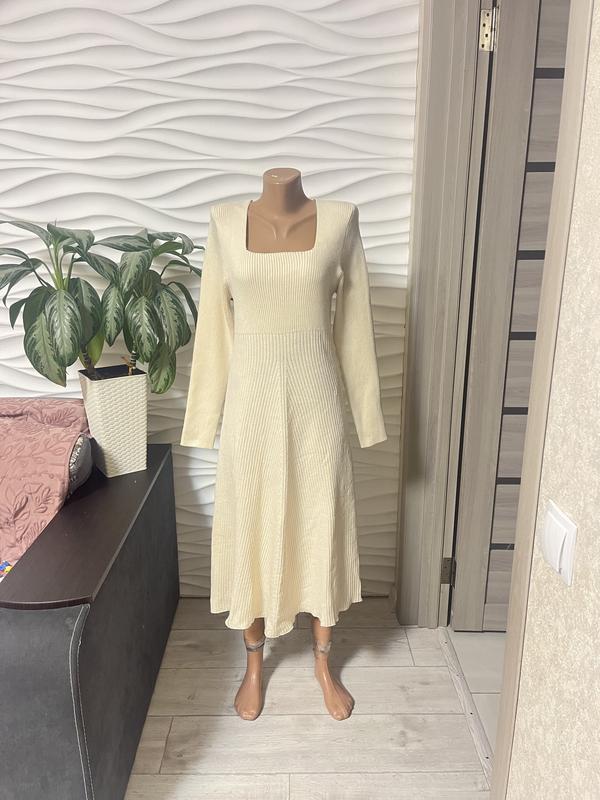 Сукня в рубчик молочного кольору з довгим рукавом. Модель міді, приталена у верхній частині та розкльошена від талії, красиво підкреслює фігуру. Квадратний виріз додає елегантності, м’який трикотаж приємний до тіла й добре тягнеться. Ідеальний варіант для повсякденних та жіночних образів. Довжина 113см Пог 46/47см в спокої Гарно тягнеться