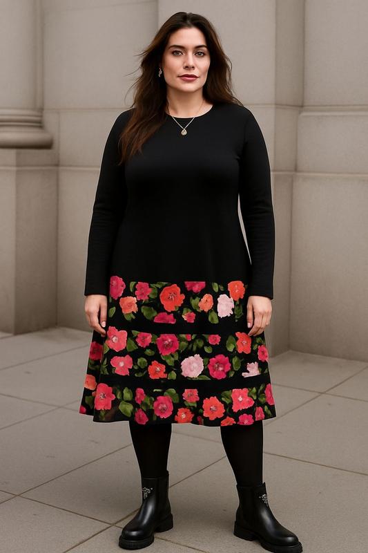 Женское платье миди с цветочным принтом. Собственная вещь, не сток. Размер 58 (по набору). Но крупномерит за счет свободного пошива, поэтому следует ориентироваться на замеры. Замеры по изделию: НОГ- 63см НОТ-67см ПОБ-свободное Длина - 108см (нижние колени), внизу цветочный волан. Есть карманы. Материал: 35% -вискоза, 35%- коттон, 30%-полиэстер. Верх- французский трикотаж, цветочный волан - коттон. Стильная вещь в вашем гардеробе)