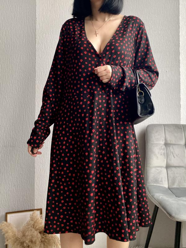 Сукня в червоні квітки, р-р 20 Стан відмінний ПОГ 60-72 ПОТ 53-63 ПОС 70 Рукав 63 Довжина 103 Плечі 43 Склад: 99 поліестр, 1 ЕЛАСТАН