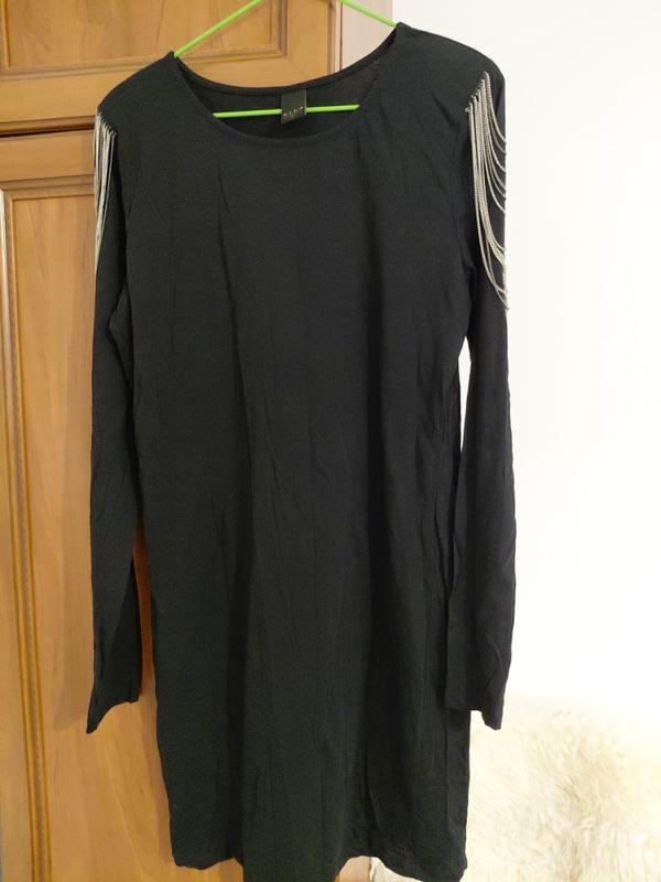черное платье с длинными рукавами и декоративными металлическими цепочками на плечах. ог 48 см об47 см длина 85 см длина рукава 66 см.
