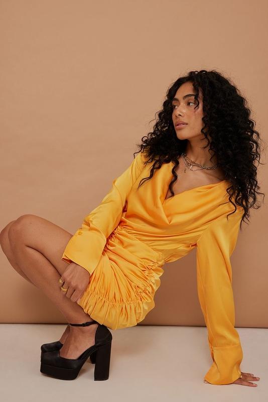 Помаранчева атласна сукня від NA-KD. Розмір на бірці Eur 36. Спідничка у сукня має подвійну тканину, з боку є скрита блискавка. Довгий рукав, з ґудзиком, який можна підкотити. Також сукня має плічка. Горловина йде хомутиком. Заміри: Ширина підмишками - 48 см Талія - 35 см Довжина рукава - 61 см Довжина спіднички від талії - 42 см Довжина по спинці - 80 см