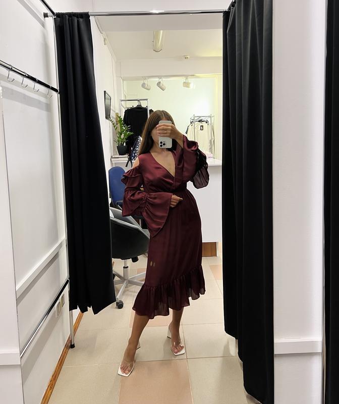 Розкішна грайлива сукня міді з рюшами та відкритими плечима. Лінія талії підвищена відрізна. V-подібне декольте на запах. Красиві розкльошені рукави. Є підкладка. Сукня всесезон. Трендовий колір бордо ЗаміриXS: пог 43+, пот 28 гумка тягнеться до 46. Поб 54. Довжина 110 Заміри S: пог 46+. Пот 30 тягнеться до 47. Поб 56. Довжина 110