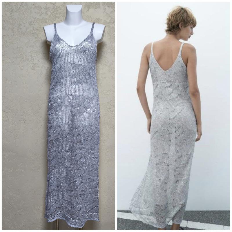 Сукня-комбінація з в'язання та металевих ниток ZARA. Виконана зі сріблястої блискучої пряжі з крихітними паєтками, на підкладці. Ця довга сукня створена, щоб привернути увагу своїм невимушеним шармом, виготовлена з металевих ниток, що відбивають світло з усіх боків, вона має чуттєвий облягаючий силует, ажурне плетіння, круглий виріз горловини та тонкі бретельки. 💫 Стан: ідеальний 💫 Розмір: L 💫Склад: 94% поліестер, 6% металізоване волокно 💫 Заміри: довжина 130 , пог 50-52, пот 48-50, пос 52-54.