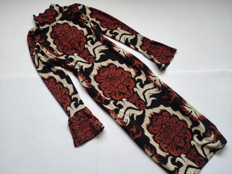 Платье миди с открытыми плечами Размер указанный L ПОГ - 48, тянется до 51, ПОТ - 43, тянется до 46, ПОБ - 47, тянется до 52. Длина 109. 63% полиэстер, 33% вискоза, 4% эластан Состояние новой Стильное и эффектное платье ✨ Открытые плечи и выразительный орнамент добавляют образу женственности и легкой соблазнительности Элегантный вариант для тех, кто ценит уверенный и яркий образ 🤍
