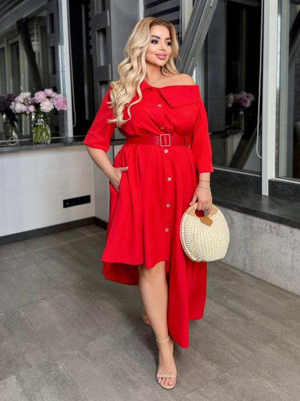 🔺Вільна сукня-трапеція з асиметричним низом і відкритим плечем . Ідеальна для особливих моментів і повсякденної елегантності. Пояс з єко шкіри в комплекті. 253АВ МОДЕЛЬ 🆕 ▪️РОЗМІРИ ПОДВІЙНІ: 1) 46-48; 2) 50-52; 3) 54-56. ▪️ТКАНИНА СУПЕР СОФТ. ▪️ЦІНА 850 грн‼️ ▪️КОЛЬОРИ: чорний; джинс, червоний, мокко. ЗАМІРИ НА СУКНЮ ▪️46-48 розмір Обʼєм грудей 112 Стегно вільне Довжина з короткою сторони 97 з довгої 134 Довжина рукава 30 ▪️50-52 розмір Обʼєм грудей 116 Стегно вільне Довжина з короткої сторони 100 з довгої 136 Довжина рукава 32 ▪️54-56 розмір Обʼєм грудей 120 Стегно вільне Довжина з короткої сторони 102 з довгої 138 Довжина рукава 34 На моделі розмір 50-52
