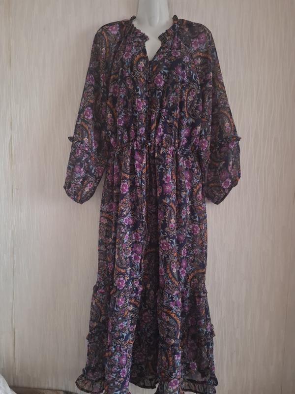 Продам шифонову сукню з оборками , по бірці Л, але орієнтуйтеся по вказаним замірам ПОГ 61 ПОТ 58 і шнурок ПОБ 72 Довжина 130 Довжина від плеча до талії 45, низ рукава резинка, гудзики обтянути тканиною Довжина рукава від горловини 67 в ідеальному стані