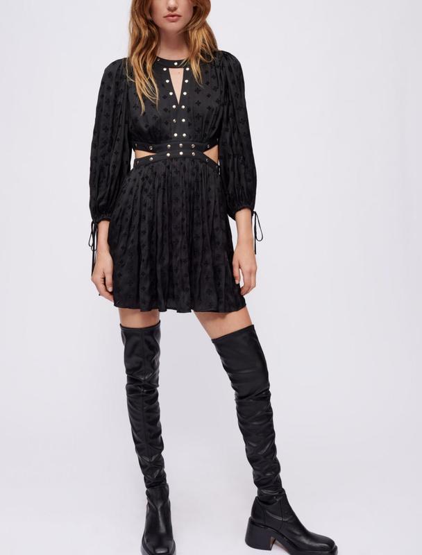 Сукня від відомого бренду maje. Коротка, струмлива сукня, розкльошена по низу. Повністю вишитий атлас. Довгі, вільні рукави з еластичним низом і зав'язками. Підкладка з віскози. Невеликий V-подібний виріз. Застібка-блискавка ззаду. Бічні вирізи