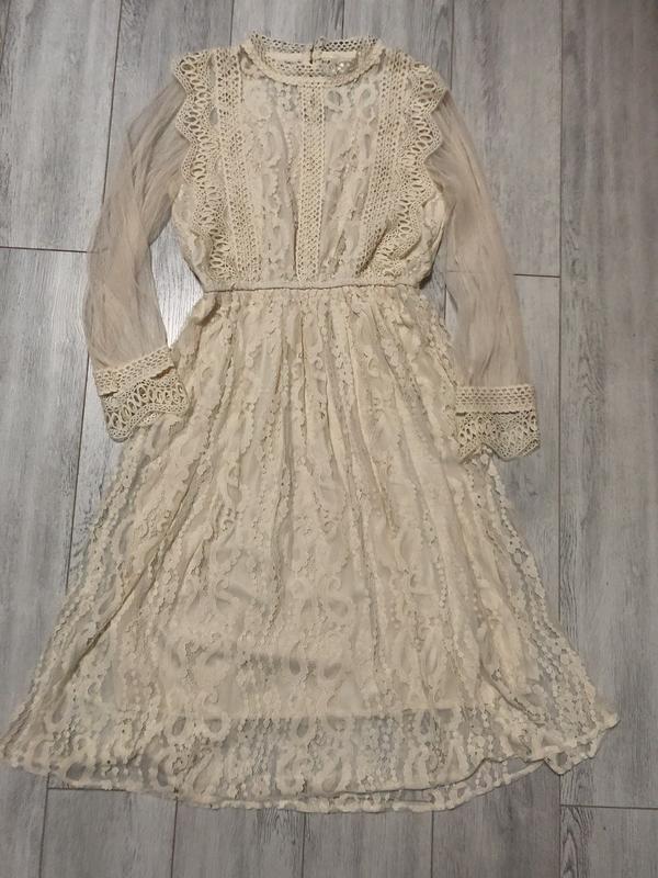 Шикарна мереживна сукня, колір молочний, нова, але без бірок, ніразу не одягалася, тільки була примірка. Нічого не просвічується, рукава шикарні.