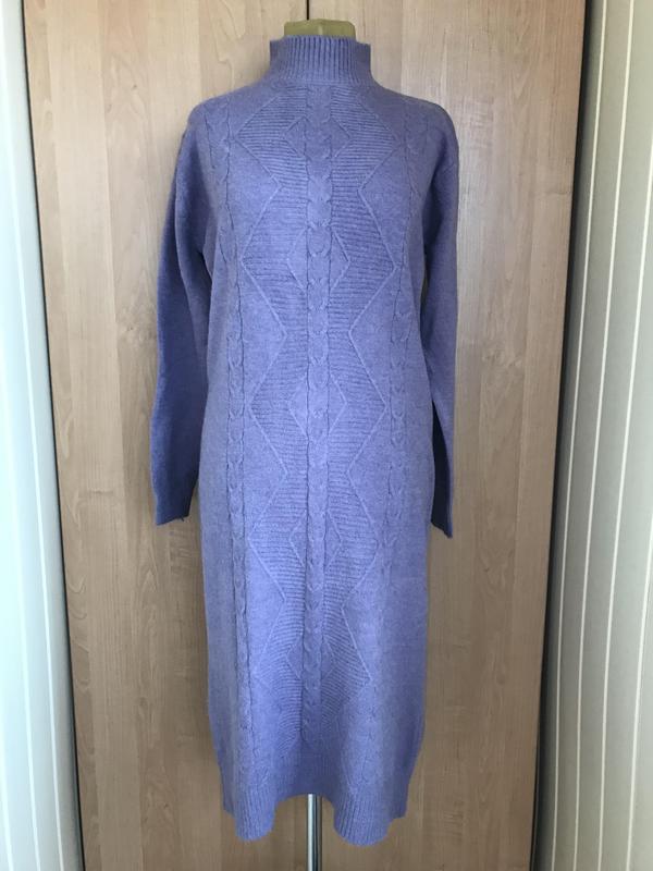 Теплое платье оверсайз сиреневого цвета, размер M (S-L). Флажок с названием бренда не обнаружен, но по качеству вязки можно судить, что вещь сделана одним из глобальных брендов H&M, C&A или ZARA. Состав: 85% акрил, 15% хлопок. Плотная вязка. Воротник стойка будет защищать от холода и ветра (фото 7). Спереди идёт узорчатый рисунок вязки: комбинация косички и ромбов незавершенной формы (фото 1-2, 7-8). Спущенное плечо. Длинный рукав. По низу плятья и краю рукавов идёт вязка резинкой. Без карманов и разрезов. Катышей нет! Показала посадку на манекенах двух размеров S и L (параметры манекенов в объявлении ниже), считаю что в обоих случаях выглядит достойно ! ) Объёмы желтого манекена, см : плечи 40, ОГ 97, ОТ 77, ОБ 100 Объёмы черного манекена, см : плечи 39, ОГ 87, ОТ 63 ОБ 90 Замеры изделия в не растянутом виде, см: плечи 47,5, подмышки (примерно равно ПОГ) 61, ПОТ 53, ПОБ (Замер делаю на расстоянии 65 см от плечевого шва, если вещь короче, то по краю изделия) 53, длина 118, длина рукава 59. Отправляю Новой почтой либо наложенным платежом (при условии оплаты доставки в оба конца), либо по предоплате на карту Приват, Укрпочтой по предоплате, Meest по предоплате Продаю много фирменных вещей Airfield, Strenesse, Gerry Weber, Steilmann, Brax, Bonita, Basler, Frank Walder, Apanage, Olsen, Ulla Popken, Gardeur, Monari, Rabe, Guess, Hauber, Marks&Spencer, Concept K. Много новых вещей (с этикеткой) - можно на подарок. Смотрите другие мои объявления. Спасибо, что заглянули :-)